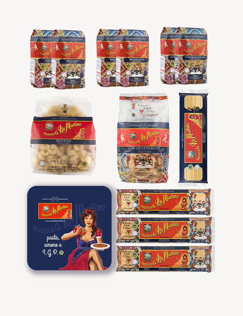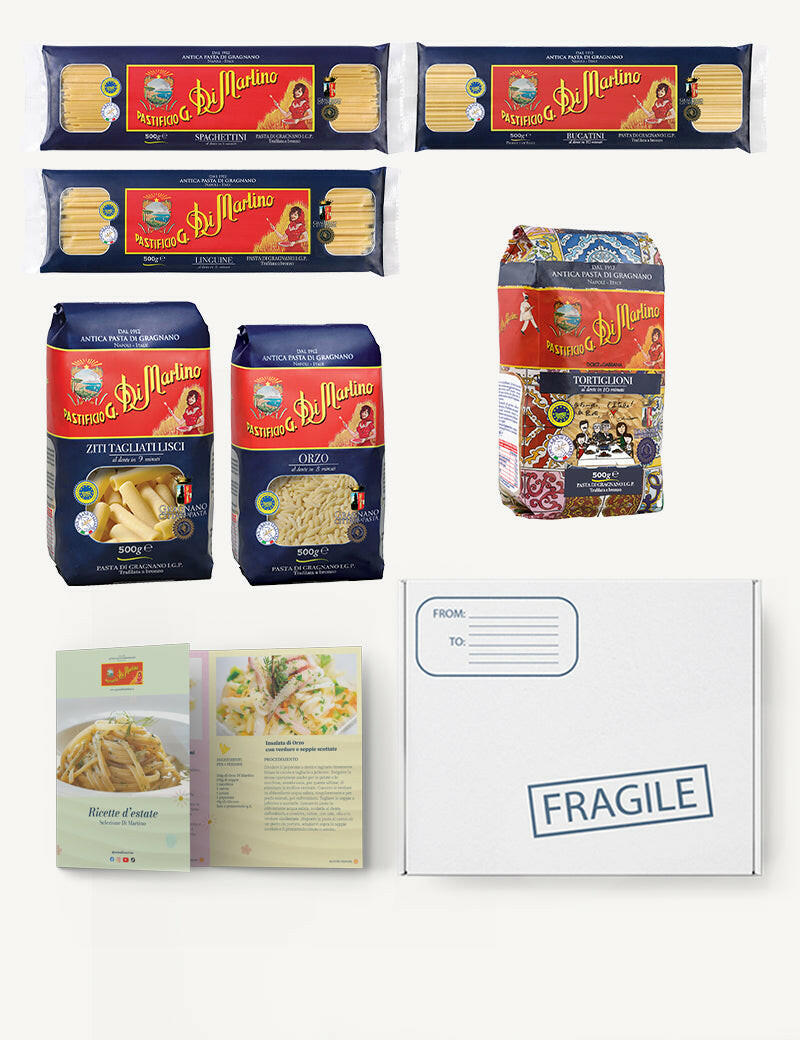 Nasce la nuova box Summer Di Martino, al suo interno potrai trovare tutti i formati di pasta IGP che si abbinano perfettamente agli ingredienti tipici della stagione estiva, ma c'è di più! All'interno della Box troverai anche un ricettario con tante idee per i tuoi piatti